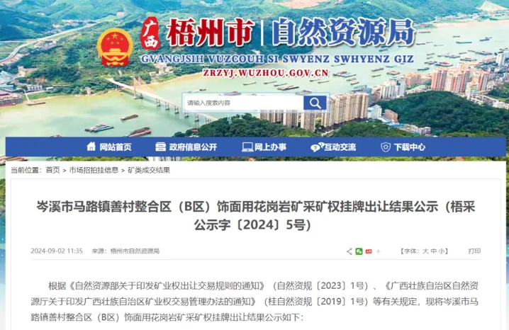 9月2日,據(jù)梧州市自然資源局官網(wǎng)公示,廣西瑞誠(chéng)礦業(yè)有限公司底價(jià)3.52億元成功競(jìng)得廣西壯族自治區(qū)岑溪市馬路鎮(zhèn)善村整合區(qū)(B區(qū))飾面用花崗巖礦采礦權(quán)。該礦資源儲(chǔ)量超1.1億噸,擬出讓年限24.2年(含基建期2年),年產(chǎn)規(guī)模近330萬(wàn)方。