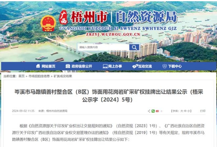 9月2日,據(jù)梧州市自然資源局官網(wǎng)公示,廣西瑞誠(chéng)礦業(yè)有限公司底價(jià)3.52億元成功競(jìng)得廣西壯族自治區(qū)岑溪市馬路鎮(zhèn)善村整合區(qū)(B區(qū))飾面用花崗巖礦采礦權(quán)。該礦資源儲(chǔ)量超1.1億噸,擬出讓年限24.2年(含基建期2年),年產(chǎn)規(guī)模近330萬(wàn)方。