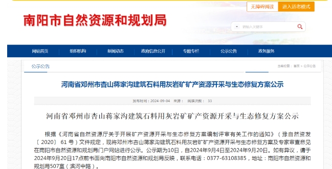 2024年9月4日,南陽市自然資源和規(guī)劃局發(fā)布《河南省鄧州市杏山蔣家溝建筑石料用灰?guī)r礦礦產(chǎn)資源開采與生態(tài)修復(fù)方案公示》,將鄧州市杏山蔣家溝建筑石料用灰?guī)r礦礦產(chǎn)資源開采與生態(tài)修復(fù)方案及專家審查意見進(jìn)行公示,公示表明,經(jīng)專家評審,《方案》符合礦產(chǎn)資源開采與生態(tài)修復(fù)的有關(guān)規(guī)定、規(guī)范和標(biāo)準(zhǔn),同意評審?fù)ㄟ^。