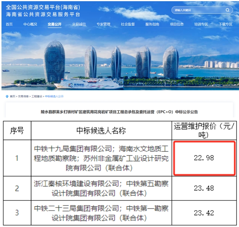中鐵十九局集團(tuán)、海南水文地質(zhì)工程地質(zhì)勘察院、蘇州中材非金屬礦工業(yè)設(shè)計(jì)研究院(聯(lián)合體)投標(biāo)報(bào)價(jià)5.05億,運(yùn)營維護(hù)報(bào)價(jià)22.98元/噸入選,位于候選人第一,計(jì)劃工期315日歷天。