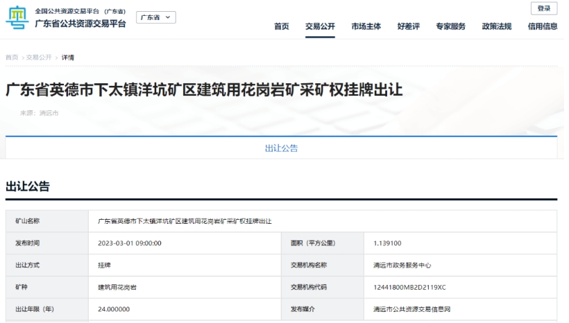 2023年4月,由中交集團(tuán)旗下第二公路工程局有限公司牽頭的聯(lián)合體競(jìng)得廣東省英德市下太鎮(zhèn)洋坑礦區(qū)。該礦資源儲(chǔ)量2.5億噸(約9260萬(wàn)方),設(shè)計(jì)年產(chǎn)規(guī)模400萬(wàn)方,出讓年限24年。
