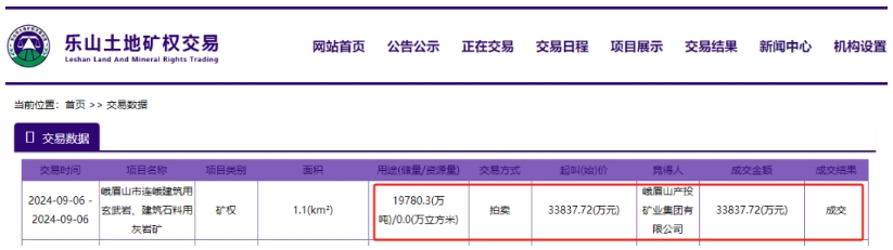 據(jù)悉,四川省峨眉山市連峨建筑用玄武巖、建筑石料用灰?guī)r礦采礦權(quán)被峨眉山產(chǎn)投礦業(yè)集團(tuán)有限公司以底價(jià)33837.72萬(wàn)元拍得。該礦資源儲(chǔ)量7272.3萬(wàn)方(近2億噸),生產(chǎn)規(guī)模220萬(wàn)方/年,出讓年限30年,折合資源價(jià)款4.65元/方(1.71元/噸)。