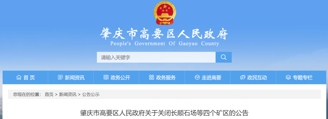 肇慶市高要區(qū)人民政府關(guān)于關(guān)閉長(zhǎng)順石場(chǎng)等四個(gè)礦區(qū)的公告
