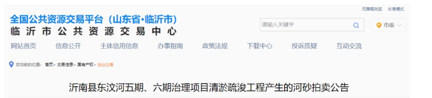 據(jù)悉,山東沂南縣發(fā)布河砂拍賣公告,公告表示將于2024年09月13日10時(shí)在臨沂市公共資源電子交易平臺(tái)公開(kāi)拍賣沂南縣東汶河五期、六期治理項(xiàng)目清淤疏浚工程產(chǎn)生的約100萬(wàn)噸河砂,起拍價(jià):5000萬(wàn)元,單價(jià)為50元/噸。
