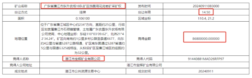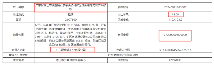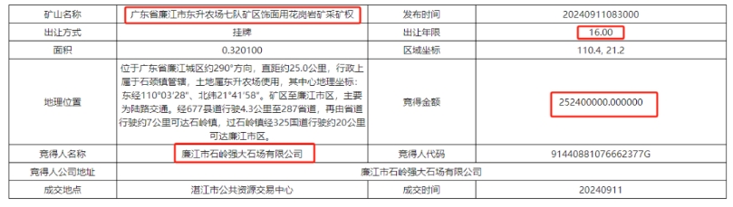 近日,廣東省湛江市公共資源交易中心發(fā)布六宗花崗巖礦采礦權(quán)出讓結(jié)果,六宗花崗巖礦山資源量共計超3670萬方,成交額超51470萬元。其中廣東省廉江市東升農(nóng)場七隊礦區(qū)飾面用花崗巖礦采礦權(quán)被廉江市石嶺強大石場有限公司以2.542億元競得,是六宗礦權(quán)中最大的一宗。
