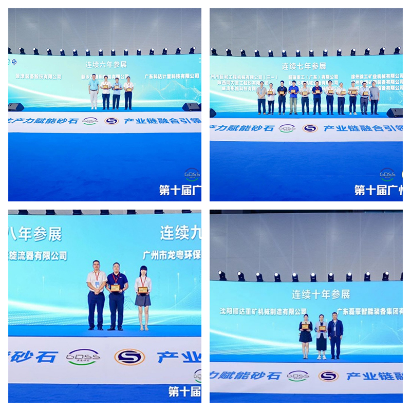 展會(huì)現(xiàn)場,主辦方廣東省砂石分會(huì)領(lǐng)導(dǎo)為連續(xù)參展六年、七年、八年、九年、十年的企業(yè)進(jìn)行頒獎(jiǎng)。