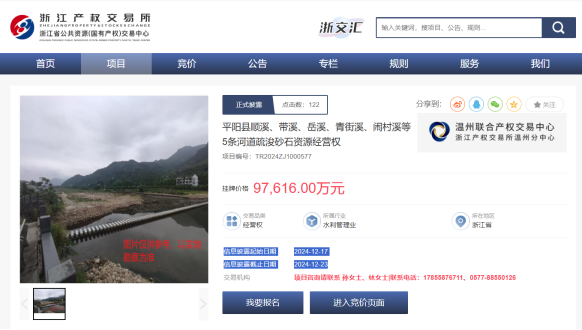 根據(jù)公告,該項(xiàng)目報(bào)名時(shí)間為2024年12月17至2024年12月23日下午5時(shí)止。成交后,競得人需在競價(jià)成交之日起60個(gè)工作日內(nèi)一次性支付全部費(fèi)用,具體以《平陽縣順溪、帶溪、岳溪、青街溪、鬧村溪等5條河道疏浚砂石資源經(jīng)營權(quán)轉(zhuǎn)讓合同》約定為準(zhǔn)。