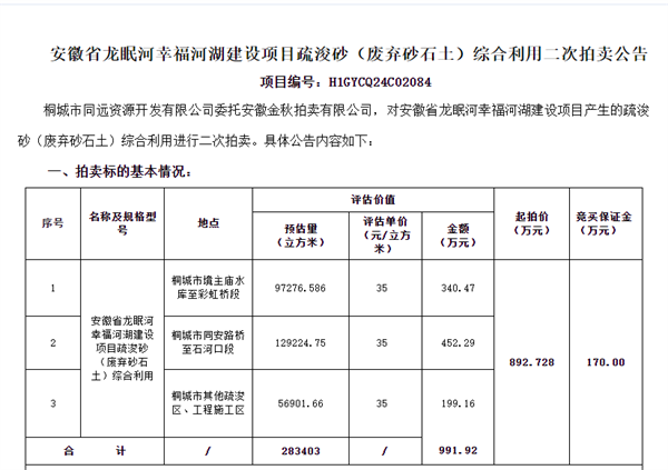 據(jù)公告顯示,此次拍賣標(biāo)的為安徽省龍眠河幸福河湖建設(shè)產(chǎn)生的河道疏浚砂(廢棄砂石土),其中廢棄砂石土上岸量(處置量)約21.22萬方,淤泥等廢棄物上岸量(處置量)約7.12萬方,合計(jì)約28.34萬方。買受人僅負(fù)責(zé)拍賣標(biāo)的裝運(yùn),不得自行在河道開挖。