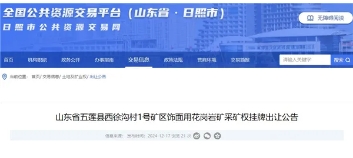12月17日,山東省日照市公共資源交易網(wǎng)發(fā)布五蓮縣西徐溝村1號礦區(qū)飾面用花崗巖礦掛牌出讓公告。該礦可采礦石量7018.35萬方,開采規(guī)模145萬方/年,起始價近8億元。掛牌時間為2025年1月15日至2025年2月5日。