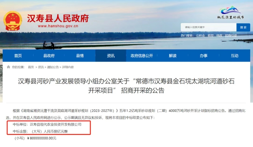近日,湖南省常德市漢壽縣人民政府發(fā)布了漢壽縣金石垸、太湖垸河道砂石開(kāi)采項(xiàng)目中標(biāo)結(jié)果。通過(guò)招商比選,漢壽縣現(xiàn)代農(nóng)業(yè)投資開(kāi)發(fā)有限公司以8億元中標(biāo)了這2處河砂開(kāi)采權(quán),采砂控制量為4000萬(wàn)噸,成交單價(jià)為20元/噸。