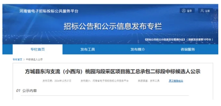 近日,河南省電子招標(biāo)投標(biāo)公共服務(wù)平臺發(fā)布河南省南陽市方城縣東溝支流(小西溝)桃園溝段采區(qū)項目施工總承包二標(biāo)段中標(biāo)候選人公示。山西三建集團有限公司、中交第三公路工程局有限公司、中交第二航務(wù)工程局有限公司組成的聯(lián)合體以39.8億元的報價成為該項目第一中標(biāo)候選人。