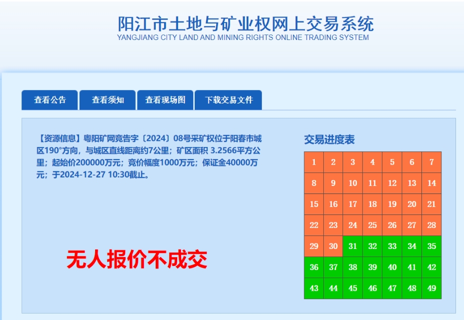 近日,廣東省陽江市陽春市輪崗礦區(qū)建筑用花崗巖礦采礦權(quán)因無人報價而流拍。 該礦權(quán)已經(jīng)是第三次流拍了 2023年11月 該項目首次掛牌出讓 歷經(jīng)2次延遲 最終還是流拍 2024年2月 該項目第二次發(fā)布出讓公告 但是在正式掛牌前一天 突然發(fā)布終止出讓公告 2024年10月22日 該項目發(fā)布第3次出讓公告 并降低6億的額外支付費用 歷經(jīng)多次延遲 依舊無人報名 該項目建筑用花崗巖資源儲量32601.77萬立方米,半風(fēng)化花崗巖2885.2萬立方米,全風(fēng)化花崗巖4224.22萬立方米,設(shè)計生產(chǎn)規(guī)模1200萬方/年,擬出讓年限28年,掛牌起始價為20億元,還需支付額外費用22.22億元。
