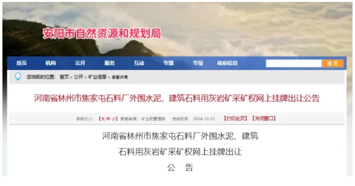 2024年12月31日,河南省安陽(yáng)市自然資源和規(guī)劃局發(fā)布林州市焦家屯石料廠外圍水泥、建筑石料用灰?guī)r礦采礦權(quán)網(wǎng)上掛牌出讓公告。出讓礦區(qū)范圍可利用資源量合計(jì)約2.22億噸(水泥用灰?guī)r礦+建筑石料用灰?guī)r礦),設(shè)計(jì)礦山總開(kāi)采規(guī)模980萬(wàn)噸/年,總服務(wù)年限為23.5年(基建期1年),起始價(jià)為6.37億元。經(jīng)計(jì)算,該項(xiàng)目起拍成本約2.873元/噸。