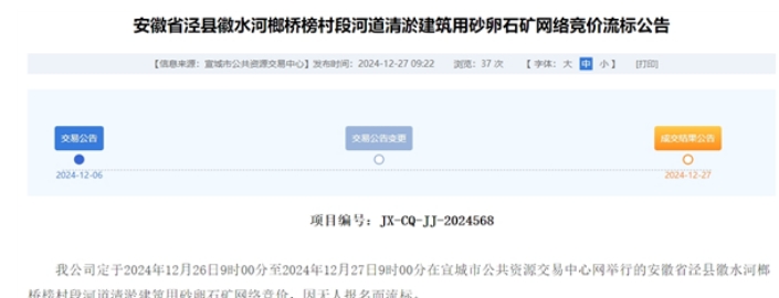 近日,安徽宣城市公共資源交易中心發(fā)布涇縣徽水河榔橋榜村段河道清淤建筑用砂卵石礦網(wǎng)絡(luò)競價(jià)流標(biāo)公告。該項(xiàng)目拍賣資源儲量約50萬噸,起始單價(jià)29元/噸,起始總價(jià)1450萬元,因無人報(bào)名而流標(biāo)。