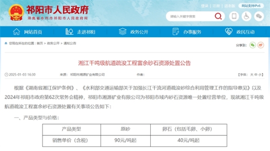 近日,湖南祁陽(yáng)市人民政府發(fā)布湘江千噸級(jí)航道疏浚工程富余砂石資源處置公告,共處置原砂、卵石等砂石產(chǎn)品,其中,原砂銷售單價(jià)(含稅)90元/噸起、卵石(包括毛卵、小卵)銷售單價(jià)(含稅)40元/噸起。 公告顯示,該項(xiàng)目實(shí)行逐船量方,以運(yùn)輸船登記海事噸位為單船結(jié)算噸位標(biāo)準(zhǔn)。買家可選擇在祁陽(yáng)市天馬路2號(hào)臨時(shí)上砂點(diǎn)(祁陽(yáng)市寶陽(yáng)混凝土廠內(nèi))或祁陽(yáng)市白水鎮(zhèn)湘湖村臨時(shí)上砂點(diǎn)(祁陽(yáng)盛水混凝土廠內(nèi))進(jìn)行提貨,自行裝車并承擔(dān)相關(guān)費(fèi)用??蛻羲?gòu)砂石從指定碼頭上岸入臨時(shí)堆場(chǎng)后,48小時(shí)內(nèi)必須清場(chǎng),超時(shí)按照船舶噸位收取1.5元/噸/天的堆場(chǎng)管理費(fèi)。 另外,該項(xiàng)目富余河卵石為未經(jīng)加工的天然河卵石原材料,不受顆粒級(jí)配、細(xì)度模數(shù)、顆粒含量、含泥量、泥塊含量等標(biāo)準(zhǔn)及相關(guān)規(guī)定的限制,一經(jīng)交付則不予退換,并視為交貨。