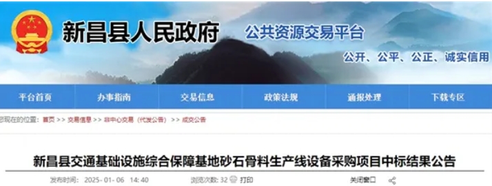 1月6日,浙江省紹興市新昌縣人民政府發(fā)布新昌縣交通基礎(chǔ)設(shè)施綜合保障基地砂石骨料生產(chǎn)線(xiàn)設(shè)備采購(gòu)項(xiàng)目中標(biāo)公告,確定浙江雙金機(jī)械集團(tuán)股份有限公司為該項(xiàng)目的中標(biāo)人,中標(biāo)價(jià)格近1620.3萬(wàn)元。