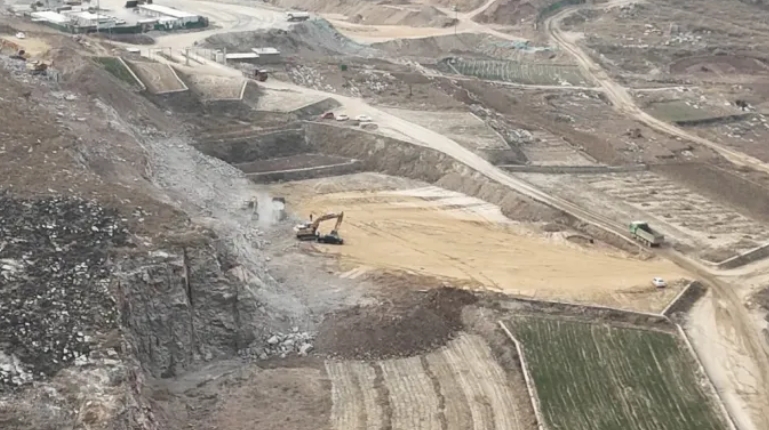 在當(dāng)?shù)卮迕竦膸ьI(lǐng)下,記者來(lái)到蒙陰縣聯(lián)城鎮(zhèn)相家莊子村村北。現(xiàn)場(chǎng)多臺(tái)挖掘機(jī)和裝載機(jī)正在作業(yè),施工現(xiàn)場(chǎng)的情況讓人看來(lái)觸目驚心。由于這個(gè)位置位于山東省新泰市汶南鎮(zhèn)和山東蒙陰縣聯(lián)城鎮(zhèn)兩界交匯處,為了證實(shí)歸屬的問(wèn)題,記者聯(lián)系了蒙陰縣聯(lián)城鎮(zhèn)政府的工作人員。