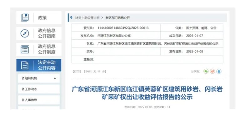 1月8日,廣東省河源江東新區(qū)黨政辦公室發(fā)布臨江鎮(zhèn)芙蓉礦區(qū)建筑用砂巖、閃長巖礦采礦權(quán)出讓收益評估報告,擬對其進(jìn)行出讓。該礦保有建筑用石料資源量2706.01萬方,生產(chǎn)規(guī)模130萬方/年,估算服務(wù)年限21年,估值近1.2億元。 礦區(qū)面積為0.6257平方千米,礦區(qū)范圍內(nèi)建筑用砂巖控制資源量2564.91萬方、建筑用閃長巖控制資源量55.62方、建筑用閃長巖推斷資源量85.48萬方。礦床規(guī)模屬中型,該礦區(qū)范圍內(nèi)未設(shè)置其他礦業(yè)權(quán),無礦業(yè)權(quán)權(quán)屬爭議。 該采礦權(quán)位于河源市區(qū)約175°方位,直距約10千米處,行政區(qū)隸屬江東新區(qū)臨江鎮(zhèn)管轄。礦區(qū)距東環(huán)快速路約1.5千米,距贛深高鐵直線距離1.1千米,距河源東站距離約2千米,由河源市可通往全國各地,交通十分便利。 根據(jù)現(xiàn)場調(diào)查以及對礦業(yè)權(quán)人的問詢,礦區(qū)周邊無其他相鄰礦業(yè)權(quán)設(shè)置。礦區(qū)東側(cè)305米有一擬設(shè)采礦權(quán),為廣東省河源江東新區(qū)臨江鎮(zhèn)桐子凹礦區(qū)建筑用變質(zhì)砂巖礦采礦權(quán)。