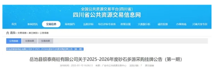 1月10日,四川省公共資源交易信息網(wǎng)發(fā)布岳池縣銀泰商砼有限公司關(guān)于2025-2026年度砂石多源采購(gòu)掛牌公告(第一期),主要采購(gòu)山碎石、碎石約27萬(wàn)噸,石粉約25萬(wàn)噸,天然砂(河砂)約5萬(wàn)噸,供應(yīng)期1年。 根據(jù)公告,本期收購(gòu)價(jià)格為山碎石80元/噸(規(guī)格10mm-25mm)、山碎石細(xì)石(需整形)(5mm-10mm)83元/噸、山碎石機(jī)制砂(精品石粉)86元/噸、卵碎石77元/噸、卵石機(jī)制砂(卵石粉)82元/噸、天然砂(河砂)108元/噸。以上價(jià)格于2025年1月10日17時(shí)00分生效,均含稅含運(yùn)費(fèi)等。 在供應(yīng)期間內(nèi),采購(gòu)方將定期抽查供應(yīng)商,一旦被工商行政主管部門列入經(jīng)營(yíng)異常名錄、嚴(yán)重違法失信企業(yè)名單(黑名單);被全國(guó)法院列入失信人被執(zhí)行名錄;被列入政府采購(gòu)嚴(yán)重違法失信行為記錄名單;采購(gòu)方將取消其供應(yīng)資格。 據(jù)悉,岳池縣銀泰商砼有限公司是岳池發(fā)展建設(shè)集團(tuán)有限公司全資子公司,成立于2016年11月,注冊(cè)資金1億元,位于四川省廣安市岳池縣白廟鎮(zhèn)黃蓮橋村17組。公司主營(yíng)預(yù)拌商品混凝土、預(yù)拌砂漿生產(chǎn)及銷售等,具有國(guó)家預(yù)拌商品混凝土專業(yè)承包資質(zhì),主要生產(chǎn)C15-C60等十余種型號(hào)混凝土。