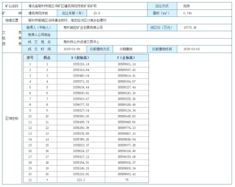 近日,湖北省鄂州市細(xì)王沖礦區(qū)建筑用花崗巖礦采礦權(quán)出讓交易結(jié)果正式公示。此次出讓受鄂州市自然資源和城鄉(xiāng)建設(shè)局委托,由鄂州市自然資源交易中心與湖北德潤(rùn)古今拍賣有限公司以拍賣方式進(jìn)行。 最終,鄂州城控礦業(yè)發(fā)展有限公司以19775.38萬(wàn)元的價(jià)格成功競(jìng)得該采礦權(quán)。其公司位于湖北省鄂州市鄂城區(qū)鳳凰街道葛山大道99號(hào),統(tǒng)一社會(huì)信用代碼為91420704MA4F49PX31。成交時(shí)間為2025年1月10日,地點(diǎn)在鄂州市公共資源交易中心,參與此次拍賣的競(jìng)買人僅有1人。 該礦區(qū)位于鄂州市鄂城區(qū)澤林鎮(zhèn)涂橋村、臨空經(jīng)濟(jì)區(qū)沙窩鄉(xiāng)趙寨村,面積為0.744平方千米,開(kāi)采礦種為建筑用花崗巖,開(kāi)采標(biāo)高在 223.3 米至75米之間。根據(jù)《湖北省鄂州市細(xì)王沖礦區(qū)建筑用花崗巖礦勘探報(bào)告評(píng)審意見(jiàn)書》,截至2024年9月,擬設(shè)采礦權(quán)范圍內(nèi)查明建筑用石料資源量4286.6萬(wàn)方/11188.1萬(wàn)噸,其中包括探明資源量、控制資源量和推斷資源量。擬出讓年限為20.8年,起始價(jià)為19729萬(wàn)元,出讓收益率為0%。 采礦權(quán)成交價(jià)的繳納時(shí)間為2025年2月3日,采用分期繳納的方式。公示期從2025年1月14日至2025年1月28日,若對(duì)公示內(nèi)容有異議,可在公示期內(nèi)以書面形式向鄂州市自然資源和城鄉(xiāng)建設(shè)局反映。公示無(wú)異議后,競(jìng)得人需在公示期結(jié)束后5個(gè)工作日內(nèi)與出讓人簽訂《采礦權(quán)出讓合同》,并在履行相關(guān)手續(xù)后,持成交確認(rèn)書、礦業(yè)權(quán)出讓合同、出讓收益繳納憑證等材料申請(qǐng)辦理采礦權(quán)登記手續(xù)。 此次采礦權(quán)的成功出讓,將為鄂州市的建筑用花崗巖資源開(kāi)發(fā)利用提供有力保障,同時(shí)也為當(dāng)?shù)氐慕?jīng)濟(jì)發(fā)展注入新的活力,后續(xù)該項(xiàng)目的開(kāi)發(fā)建設(shè)值得持續(xù)關(guān)注。
