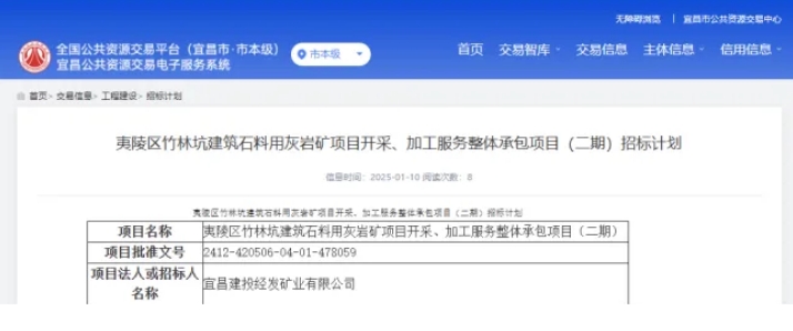 日前,湖北省宜昌市公共資源交易中心發(fā)布夷陵區(qū)竹林坑建筑石料用灰?guī)r礦項目開采、加工服務整體承包項目(二期)招標計劃。 據(jù)招標公告,該項目實行礦山開采、加工服務整體承包模式,主要內容包括礦山開采、骨料加工、項目移交等。開采、加工規(guī)模200萬噸/年,投資估算8000萬元,項目業(yè)主為宜昌建投經發(fā)礦業(yè)有限公司。 據(jù)悉,夷陵區(qū)竹林坑建筑石料用灰?guī)r礦項目位于宜昌市夷陵區(qū)龍泉鎮(zhèn)雙泉村,距夷陵區(qū)龍泉鎮(zhèn)17公里,距宜昌東站36公里。礦區(qū)面積0.499平方公里,灰?guī)r資源儲量約7800萬噸,礦山設計開采規(guī)模為300萬噸/年,配套骨料生產線生產能力為1600噸/小時。 礦山各項手續(xù)齊全,采礦許可證、安全生產許可證均在有效期。