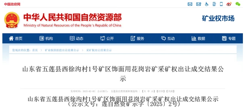 2025年2月5日,山東省五蓮縣西徐溝村1號(hào)礦區(qū)飾面用花崗巖礦采礦權(quán)在日照市公共資源交易中心由五蓮縣綠色礦山發(fā)展有限責(zé)任公司競得。