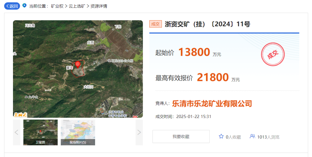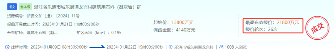 近日,浙江省樂清市城東街道龍興村建筑用石料(凝灰?guī)r)礦采礦權(quán)被樂清市樂龍礦業(yè)有限公司拍得,出讓底價(jià)為13800萬元,經(jīng)歷26輪次報(bào)價(jià),溢價(jià)57.9%,以21800萬元成功競得。該礦區(qū)范圍內(nèi)出讓資源量共計(jì)1208.42萬噸,年產(chǎn)310萬噸,擬出讓年限5年,單價(jià)約為18元/噸。 據(jù)悉,為滿足礦產(chǎn)品外運(yùn)需求,競得人需支付礦區(qū)至慎海橋路段(約3.076km)和海虹橋至慎南橋段路段(326米)專用運(yùn)輸?shù)缆返慕ㄔO(shè)費(fèi)用1626.4103萬元。 資源儲(chǔ)量:礦區(qū)范圍內(nèi)出讓資源量共計(jì)1208.42萬噸,其中建筑用石料礦(中風(fēng)化凝灰?guī)r)控制資源量1177.92萬噸,宕碴30.50萬噸。剝離物(殘破積土)34.47萬立方米。 據(jù)悉,為滿足礦產(chǎn)品外運(yùn)需求,競得人需支付礦區(qū)至慎海橋路段(約3.076km)和海虹橋至慎南橋段路段(326米)專用運(yùn)輸?shù)缆返慕ㄔO(shè)費(fèi)用1626.4103萬元。道路建設(shè)由樂清市城東街道辦事處負(fù)責(zé),專用道路使用期限自礦山基建期滿之日起至采礦許可證有效期滿之日止,其他事宜按雙方簽訂的道路建設(shè)使用協(xié)議執(zhí)行。項(xiàng)目前期報(bào)告編制費(fèi)用合計(jì)151.6582萬元(已納入政策處理費(fèi)),由競得人在采礦權(quán)有償出讓合同簽訂之日起10日內(nèi)一次性繳納至樂清市財(cái)政局指定賬戶。 采礦許可證到期后,若出讓資源量仍有剩余,經(jīng)樂清市人民政府同意后可延續(xù),延續(xù)時(shí)間不超過2年(若政策調(diào)整,從其規(guī)定)。 競得人在簽訂采礦權(quán)有償出讓合同之日起30日內(nèi)建立礦山地質(zhì)環(huán)境保護(hù)與土地復(fù)墾基金賬戶,金額為2985.4733萬元,計(jì)提標(biāo)準(zhǔn)按浙財(cái)綜〔2020〕14號(hào)文件要求執(zhí)行。采礦權(quán)競得人在礦山開發(fā)利用時(shí)需采取切實(shí)有效的地質(zhì)災(zāi)害防治措施,所需費(fèi)用由競得人自行承擔(dān)。 據(jù)了解,樂清市樂龍礦業(yè)有限公司成立于2017年06月12日。經(jīng)營范圍包括建筑用石料(凝灰?guī)r)露天開采:石材加工、銷售;填方、填土工程服務(wù),屬于私營企業(yè)。