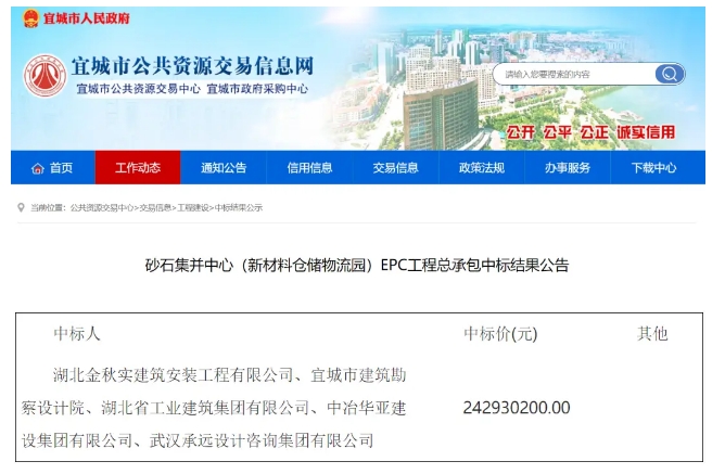 近日,湖北省宜城市砂石集并中心(新材料倉儲物流園)EPC工程總承包發(fā)布中標(biāo)結(jié)果公示。 湖北金秋實(shí)建筑安裝工程有限公司、宜城市建筑勘察設(shè)計(jì)院、湖北省工業(yè)建筑集團(tuán)有限公司、中冶華亞建設(shè)集團(tuán)有限公司、武漢承遠(yuǎn)設(shè)計(jì)咨詢集團(tuán)有限公司以24293.02萬元中標(biāo)該項(xiàng)目。 該項(xiàng)目建設(shè)地點(diǎn)在湖北省宜城市小河鎮(zhèn),本項(xiàng)目擬新建新材料倉儲物流園,總用地面積為134519㎡。總建筑面積為72603.34㎡,新增精品料分篩設(shè)施、加工、檢測和生產(chǎn)輔助設(shè)備等;配套建設(shè)道路、停車場、圍墻、綠化、環(huán)保設(shè)施、供配電、給排水、消防等公用輔助工程。 需要說明的其他事項(xiàng):本項(xiàng)目采用“評定分離”方式進(jìn)行,評標(biāo)委員會推薦3家排名不分先后的中標(biāo)候選人,中標(biāo)候選人公示期內(nèi)無異議與投訴。定標(biāo)委員會按“票決數(shù)量法”定標(biāo)。 中標(biāo)結(jié)果公示期為2025年01月16日至2025年01月20日。 砂石集并中心建設(shè)是湖北省長江沿線非法碼頭治理工作的重要組成部分。在治理工作未開展之前,湖北黃石市79公里的長江岸線,非法碼頭達(dá)106個,非法泊位123個。這些非法碼頭不僅侵蝕長江岸線資源,還對長江水系生態(tài)環(huán)境、航運(yùn)安全、市場秩序等構(gòu)成嚴(yán)重威脅。為全面推進(jìn)長江干線非法碼頭治理工作,湖北省早在2017年就召開全省長江干線砂石集并中心規(guī)劃布局方案座談會,統(tǒng)籌協(xié)調(diào)全省砂石集并中心規(guī)劃選址。 砂石集并中心其實(shí)是轉(zhuǎn)運(yùn)砂石物料的“中轉(zhuǎn)站”,類似于大規(guī)模的碼頭,只是更偏向于砂石物料這一塊。砂石集并中心遵循運(yùn)儲分離、砂不落地、封閉運(yùn)營、工廠管理、功能分區(qū)、防塵降噪、嚴(yán)禁超載、箱式運(yùn)輸?shù)仍瓌t,最大限度減少對生態(tài)環(huán)境的影響。砂石集并中心以現(xiàn)有碼頭為基礎(chǔ)進(jìn)行集并。砂石集并中心的運(yùn)營堅(jiān)持國有控股、股份經(jīng)營、統(tǒng)一監(jiān)管、統(tǒng)一定價、信息化管控原則,實(shí)現(xiàn)規(guī)模化運(yùn)營。 建設(shè)砂石集并中心是貫徹落實(shí)黨中央、國務(wù)院關(guān)于依托長江黃金水道推動長江經(jīng)濟(jì)帶發(fā)展戰(zhàn)略部署的重要舉措。項(xiàng)目有效推進(jìn)露天礦山整治整合,促進(jìn)資源集約化、綠色化、產(chǎn)業(yè)化轉(zhuǎn)型升級,加快實(shí)現(xiàn)“礦業(yè)生產(chǎn)基地、深加工產(chǎn)業(yè)園、專用物流碼頭”相結(jié)合的產(chǎn)業(yè)集合體,延伸上下游產(chǎn)業(yè)鏈,提高產(chǎn)品附加值。