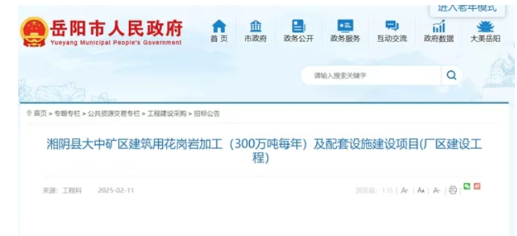 近日,湖南岳陽市人民政府發(fā)布湘陰縣大中礦區(qū)300萬噸/年建筑用花崗巖加工及配套設(shè)施建設(shè)項(xiàng)目工程總承包招標(biāo)公告。該項(xiàng)目建設(shè)單位為湖南洋石新材料科技有限公司,總投資約2.27億元,招標(biāo)控制價(jià)約1.65億元,其中工程費(fèi)1.49億元,設(shè)計(jì)費(fèi)112.54萬元,暫列金額1496.92萬元。 據(jù)招標(biāo)公告顯示,該項(xiàng)目工期要求365天,廠區(qū)用地面積4.8578公頃。主要建設(shè)內(nèi)容包括:A地塊細(xì)碎區(qū)的整形及機(jī)制砂車間、成品篩分車間、機(jī)制砂成品庫、壓濾機(jī)車間、電控及中控室、計(jì)量間、綜合樓、門衛(wèi)室、濃縮罐、污水池、自動(dòng)裝卸區(qū)、雨水收集池、皮帶廊道。 B地塊粗碎區(qū)的卸礦車間、渣土分車間、破碎車間、檢查篩分車間、機(jī)修車間、緩沖庫、綜合樓、雨水收集池、消防水池、皮帶廊道等。 據(jù)悉,該項(xiàng)目位于湘陰縣洋沙湖鎮(zhèn)大中村,資源儲(chǔ)量5361.4萬噸,出讓年限18年,2023年3月7日,湖南洋石新材料科技有限公司以2.36億元成功競(jìng)得該礦權(quán)。