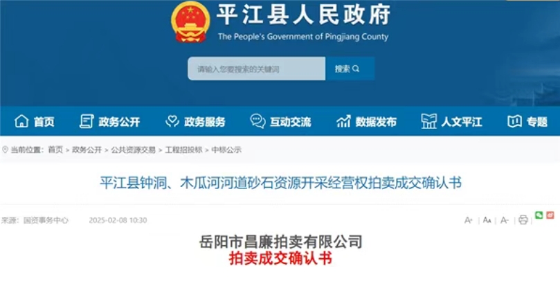 2月8日,湖南省岳陽市平江縣人民政府公布平江縣鐘洞、木瓜河河道砂石資源開采經(jīng)營權(quán)拍賣成交確認(rèn)書。買受人為湖南筑川礦業(yè)有限公司,成交金額超4.76億元。據(jù)了解,湖南筑川礦業(yè)有限公司曾于2024年底以近5億元競得平江縣昌江、仙江河道砂石資源8年開采經(jīng)營權(quán)。