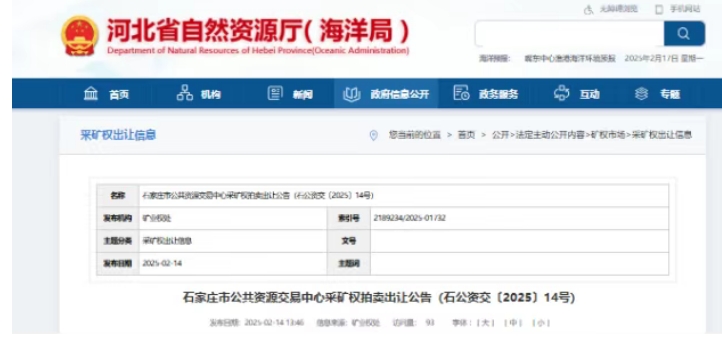 河北省石家莊市公共資源交易中心掛牌出讓河北省井陘縣南王莊冶金熔劑用灰?guī)r、石英砂巖礦(7號(hào)礦)采礦權(quán)。該礦出讓冶金熔劑用灰?guī)r、冶金熔劑用石英砂巖、建筑石料類、制磚用頁(yè)巖資源量合計(jì)約6.33億噸,出讓年限29.9年,掛牌起始價(jià)約5.08億元,折算起拍成本約0.8元/噸。 采礦權(quán)出讓收益可分期繳納。首次征收比例按采礦權(quán)出讓收益的10%繳納,剩余部分在采礦許可證有效期內(nèi)按年度平均分期繳清。采礦權(quán)出讓收益分期繳納的最后一期應(yīng)在礦業(yè)權(quán)到期30日前繳清。 根據(jù)公告,該礦位于河北省石家莊市井陘縣東南方向,行政隸屬南王莊鄉(xiāng)和南障城鎮(zhèn)管轄,面積5.26平方公里,礦區(qū)范圍內(nèi)冶金熔劑用灰?guī)r資源量總計(jì)約1.44億噸,冶金熔劑用石英砂巖資源量約1.35億噸,建筑石料用灰?guī)r、白云巖資源量4129.3萬(wàn)方(折合約1.11億噸),制磚用頁(yè)巖資源量8950.1萬(wàn)方(折合約2.42億噸)。申請(qǐng)報(bào)名起止時(shí)間為2025年2月20日9時(shí)至2025年3月12日17時(shí)。 此次出讓標(biāo)的不包括土地使用權(quán),礦區(qū)范圍內(nèi)地表附著物,如林木、種植物、道路、墳?zāi)沟认嚓P(guān)權(quán)屬的處置、拆遷等事項(xiàng),由競(jìng)得人自行協(xié)調(diào)解決,補(bǔ)償費(fèi)用由競(jìng)得人承擔(dān)。 出讓的采礦權(quán)與輸油管道重疊,競(jìng)得人應(yīng)妥善解決礦產(chǎn)資源開發(fā)活動(dòng)對(duì)輸油管線安全的影響問(wèn)題;競(jìng)得人應(yīng)妥善保護(hù)鄰近的一般耕地和永久基本農(nóng)田。礦山要嚴(yán)格按照“橫切”式開采相關(guān)規(guī)定進(jìn)行開采。