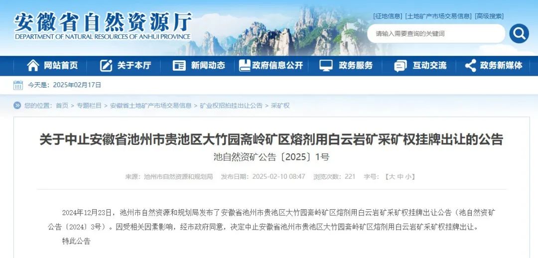 據(jù)獲悉,安徽池州市自然資源和規(guī)劃局發(fā)布消息,因受相關(guān)因素影響,經(jīng)市政府同意,決定中止安徽省池州市貴池區(qū)大竹園齋嶺礦區(qū)熔劑用白云巖礦采礦權(quán)掛牌出讓。 據(jù)了解,該礦資源總量超2億噸,擬設(shè)生產(chǎn)規(guī)模600萬噸/年,擬出讓年限25.2年,起始價(jià)為6.3億元。掛牌時(shí)間2025年1月23日至2025年2月11日。 根據(jù)公告,礦區(qū)位于池州市城東南方向110°約24公里處,行政區(qū)劃隸屬池州市貴池區(qū)墩上街道辦事處團(tuán)結(jié)村,開采礦種為熔劑用白云巖礦、建筑石料用灰?guī)r礦、建筑用白云巖礦。礦區(qū)范圍內(nèi)資源總量超2億噸,其中熔劑用白云巖礦資源量約1.33億噸、建筑石料用灰?guī)r礦資源量2847.97萬噸、建筑用白云巖礦資源量1315.39萬噸、鈣質(zhì)頁巖2623.28萬噸(可綜合利用)。 礦區(qū)交通位置圖