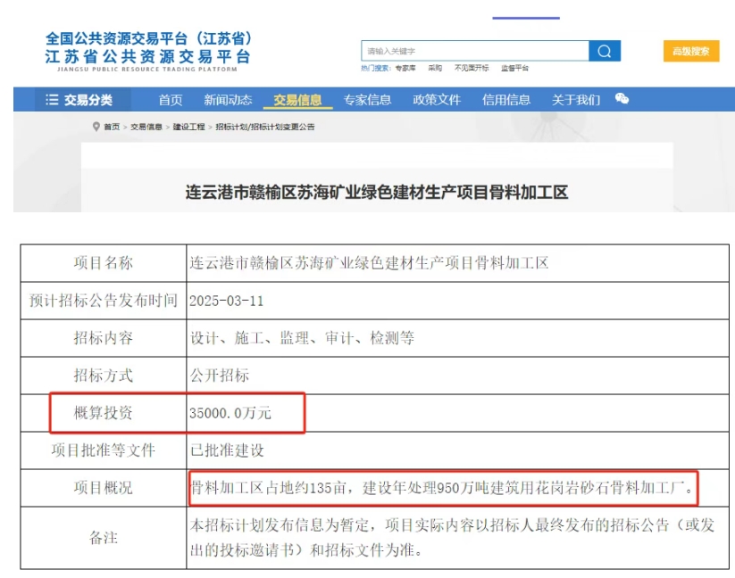 據(jù)悉,江蘇省連云港市公共資源交易平臺發(fā)布了蘇海礦業(yè)綠色建材生產(chǎn)項目骨料加工區(qū)招標計劃公告。公告顯示,該項目計劃投資3.5億元,建設年處理950萬噸砂石骨料加工廠,預計3月11日招標啟動全鏈條招標(設計、施工、監(jiān)理等)。 據(jù)了解,該礦山總儲量2.6億噸,由連云港蘇海礦業(yè)有限公司(當?shù)貒螅?023年以59.4億元競得。礦區(qū)優(yōu)先保障國家級工程“黃海糧油科技產(chǎn)業(yè)園”建設,目前每天共計出料200輛到300輛車次,共計出風化石和風化砂15000噸左右。” 據(jù)悉,為充分保障江蘇連云港市贛榆區(qū)黃海糧油產(chǎn)業(yè)園項目的用料需求,位于厲莊鎮(zhèn)的河西-銀山集中開采區(qū),在節(jié)后迅速組織了人員和設備的調配,增加了施工力量,同時優(yōu)化了施工方案,合理安排施工工序,力爭在規(guī)定的時間內完成項目建設任務。