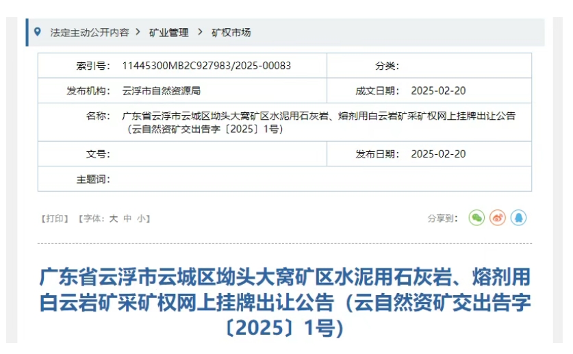 近日,廣東云浮市自然資源局發(fā)布廣東省云浮市云城區(qū)坳頭大窩礦區(qū)水泥用石灰?guī)r、熔劑用白云巖礦采礦權(quán)網(wǎng)上掛牌出讓公告。該項目礦區(qū)位于云浮市云城區(qū)城區(qū)南部18公里,開采礦種為水泥用石灰?guī)r、熔劑用白云巖,生產(chǎn)規(guī)模1100萬噸/年,掛牌起始價6.5億元,出讓年限30年。 該項目確定的水泥用石灰?guī)r、熔劑用白云巖和水泥用配料類礦石可采儲量為28484.79萬噸,其中水泥用石灰?guī)r礦17411.32萬噸,熔劑用白云巖礦8428.90萬噸,水泥配料類原料礦石量1461.09萬立方米(2644.57萬噸)。 另外,競得人須承擔(dān)礦區(qū)范圍內(nèi)的土地租金、青苗補償、遷墳費等費用2.73億元;競得人從2025年起須每年支付鄉(xiāng)村振興建設(shè)資金合計200萬元。 掛牌公告時間 2025年2月21日00:00 至 2025年3月20日23:59止 掛牌報價時間 2025年3月21日8:00 至 2025年4月7日10:00止 采礦權(quán)競得人在領(lǐng)取《采礦許可證》之日起24個月內(nèi)完成基礎(chǔ)設(shè)施建設(shè)并投產(chǎn),36個月內(nèi)達到年產(chǎn)1100萬噸的產(chǎn)量。 出讓礦區(qū)紅線范圍壓占鄉(xiāng)道Y720線,競得人需按比例承擔(dān)省道S265工程的建設(shè)費用,具體事宜由云城區(qū)人民政府與競得人另簽協(xié)議解決。 競買申請人需現(xiàn)場踏勘、咨詢礦區(qū)道路建設(shè)、租地等相關(guān)事項的,可與云浮市云城區(qū)自然資源局聯(lián)系(廣東省云浮市云城區(qū)世紀(jì)大道西117號,聯(lián)系人:黃生,聯(lián)系電話:0766-8606399)。 咨詢網(wǎng)上掛牌操作相關(guān)事項的可與云浮市公共資源交易中心聯(lián)系(節(jié)假日除外),咨詢電話:0766-8838690。 聯(lián)系地址:廣東省云浮市云城區(qū)城中路111號B座4層(云浮市公共資源交易中心服務(wù)窗口大廳)。