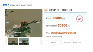 該礦出讓資源總量4969.7萬噸,設計規(guī)模990萬噸/年,出讓期限6年,起始價5億元,溫州洞頭母港礦業(yè)有限公司5.05億元競得。除競得價款外,競得人還需支付政策處理費用合計超2.56億元。