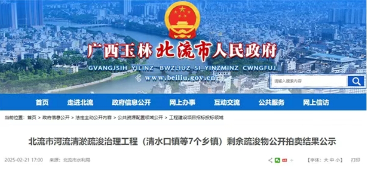 近日,廣西玉林市北流市人民政府發(fā)布北流市河流清淤疏浚治理工程(清水口鎮(zhèn)等7個鄉(xiāng)鎮(zhèn))剩余疏浚物公開拍賣結(jié)果。