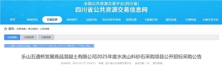 近日,四川省公共資源交易中心發(fā)布樂山五通橋發(fā)展商品混凝土有限公司2025年度水洗山料砂石采購項目公開招標采購公告。本次采購量共約11萬噸,其中碎石預估5萬噸,到場含稅價83元/噸;機制砂預估5萬噸,到場含稅價80元/噸;米石預估1萬噸,到場含稅價83元/噸。 根據(jù)采購公告,超過采購預算的報價為無效投標。招標文件發(fā)售起止時間為2025年2月28日至3月6日,投標截止時間為2025年3月20日。招標文件限價500元/包,投標保證金5萬元/家。