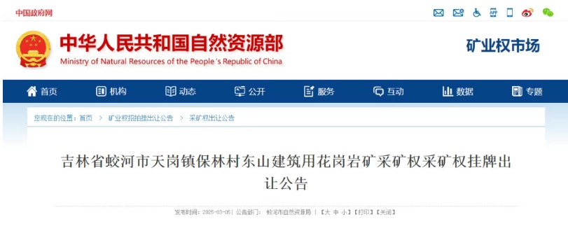 2025年3月5日,吉林省蛟河市自然資源局正式發(fā)布《吉林省蛟河市天崗鎮(zhèn)保林村東山建筑用花崗巖礦采礦權(quán)掛牌出讓公告》,擬通過公開掛牌方式出讓該礦區(qū)采礦權(quán)。此次出讓的采礦權(quán)資源儲(chǔ)量達(dá)7649.6萬立方米(約2.2億噸),起始價(jià)為6880萬元,出讓年限29.7年,旨在進(jìn)一步規(guī)范礦產(chǎn)資源開發(fā)秩序,推動(dòng)地方綠色礦業(yè)發(fā)展。