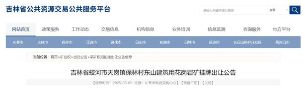 3月5日,吉林省公共資源交易平臺發(fā)布吉林市蛟河市天崗鎮(zhèn)保林村東山建筑用花崗巖礦采礦權掛牌出讓公告。該礦資源儲量7649.6萬方(超2億噸),生產(chǎn)規(guī)模為220萬方/年(594萬噸/年),服務年限29.7年,起始價6880萬元,原采礦權人資產(chǎn)超4億元,起拍成本約2.31元/噸。若由原采礦權人重新競得,該礦起拍成本約0.33元/噸。 該采礦權位于蛟河市天崗鎮(zhèn)保林村,面積0.7657平方公里,掛牌時間為2025年4月7日至2025年4月18日。有關該出讓項目采礦權生產(chǎn)和運輸過程中,所需要的用水、用電、公路、基礎設施等修建工作,由競得人自行負責并依法取得或完善相關手續(xù)。 根據(jù)公告,本次出讓的采礦權是在吉林金貴礦業(yè)有限公司(原采礦權人)采礦權基礎上擴大礦區(qū)范圍而出讓,原采礦權范圍內(nèi)剩余資源儲量、擬轉讓的房屋建筑物、設備設施等剩余資產(chǎn)價值經(jīng)專業(yè)機構評估超4億元,競買者參與競買即視為完全認可剩余資產(chǎn)評估價值。 為確保原采礦權人礦山企業(yè)正常運轉,在本次采礦權出讓期間相關證照先不予以注銷,原采礦權人承諾,若競得人非原采礦權人,原采礦權人無條件提供完整資料配合做好采礦權轉讓移交手續(xù)和《采礦許可證》等其他證照的轉讓或注銷登記手續(xù)。競得人須于簽訂《成交確認書》15個工作日內(nèi)向原采礦權人指定賬戶轉入上述全額款項,原采礦權人在收到上述資產(chǎn)評估值的全額款項后15日內(nèi)退場,若競得人為原采礦權人則無需支付該筆費用。
