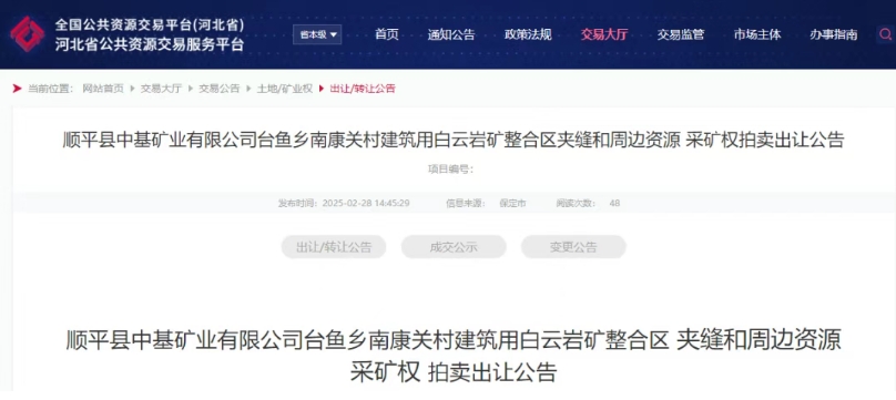 近日,河北省公共資源交易服務(wù)平臺發(fā)布順平縣中基礦業(yè)有限公司臺魚鄉(xiāng)南康關(guān)村建筑用白云巖礦整合區(qū)夾縫和周邊資源采礦權(quán)掛牌出讓公告。該礦開采礦種為建筑用白云巖,資源量5483.2萬立方米,出讓年限16.71年,起始價18387.65萬元。 據(jù)了解,競得人還需支付原采礦權(quán)順平縣中基礦業(yè)有限公司+順平縣凱瑞采石有限公司礦山資產(chǎn)組總價值超1.2億元。 值得注意的是,本次出讓的采礦權(quán)為整合區(qū)夾縫及周邊資源采礦權(quán),競買人應(yīng)承諾競得夾縫資源和周邊資源采礦權(quán)后憑出讓合同與整合主體進(jìn)行整合,不單獨辦理采礦權(quán)登記,由整合主體按照相關(guān)規(guī)定辦理整合區(qū)采礦登記手續(xù)。 據(jù)悉,礦區(qū)建筑石料用白云巖資源量礦石量5483.2萬立方米,其中:探明資源量2467.3萬立方米;控制資源量1204.7萬立方米;推斷資源量1811.2萬立方米。 據(jù)了解,原采礦權(quán)順平縣中基礦業(yè)有限公司于評估基準(zhǔn)日礦山資產(chǎn)組價值為6728.03萬元(其中固定資產(chǎn)評估值3,104.28萬元,采礦權(quán)評估值3,413.63萬元,長期待攤費用210.12萬元)。 順平縣凱瑞采石有限公司于評估基準(zhǔn)日礦山資產(chǎn)組價值為5673.16萬元(其中采礦權(quán)評估值5,607.17萬元,長期待攤費用65.99萬元)。 拍賣時間:2025年3月28日。