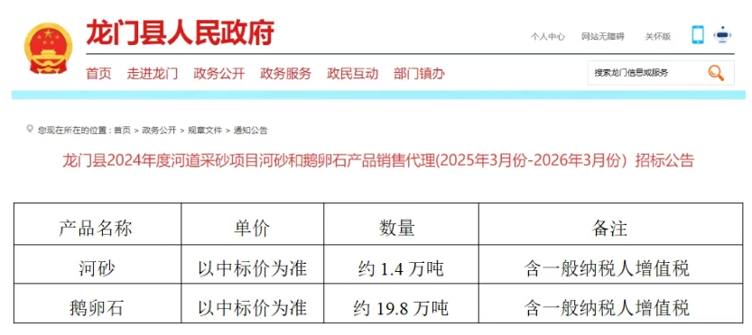 近日,廣東省惠州市龍門縣城投建設集團有限公司發(fā)布招標公告,龍門縣城投河砂開采有限公司對龍門縣2024年度河道采砂項目河砂和鵝卵石產品的銷售代理選取經銷商提供2025年3月份-2026年3月份的銷售服務,現采取現場競價方式選取合法的經銷商。 本次河道采砂項目銷售代理河砂約1.4萬噸,鵝卵石約19.8萬噸(具體銷售數量以實際生產和銷售計劃為準)。 值得注意的是,根據該項目《河砂、鵝卵石購銷協(xié)議》:甲方計劃在2025年3月份至2026年3月份期間生產約9.8萬噸的河砂,優(yōu)先直接銷售約8.4萬噸的河砂給龍門縣城投混凝土有限公司(下稱混凝土公司),具體以混凝土公司采購量為準,如果混凝土公司因各種客觀因素影響,未能購買完的其余河砂產品由乙方負責銷售,乙方必須無條件接受。 報名方式及報名時間 競價人請于2025年3月13日(9:00~12:00、14:30~17:30),持以下報名資料至龍門縣城投河砂開采有限公司(地址:龍門縣體育西路6號城投大廈11樓河砂公司辦公室)進行報名。參與競價的公司應當在競標截止時間前繳納投標保證金人民幣2萬元。 競價地點:龍門縣體育西路6號城投大廈11樓城投公司會議室。 競價時間:2025年3月14日上午9:30時。 競得人須在獲取中標通知書后三天內與甲方簽訂購銷協(xié)議,并在簽訂后三日內支付履約保證金和預付款(履約保證金為人民幣30萬元,預付款為人民幣30萬元)。 聯(lián)系方式 標的人:龍門縣城投河砂開采有限公司 聯(lián)系人:歐生、曾生 聯(lián)系電話:0752-7669225 聯(lián)系地址:龍門縣體育西路6號城投大廈11樓河砂公司辦公室