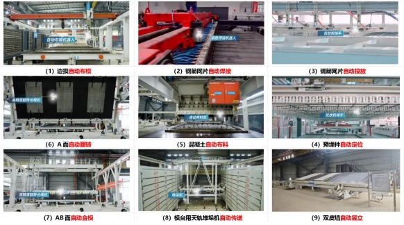 預(yù)警響應(yīng)平臺(tái) 實(shí)現(xiàn)攪拌主機(jī)內(nèi)窺鏡及出廠看料系統(tǒng)建設(shè),通過在安裝高精度、高倍變焦且可移動(dòng)的攝像頭,能夠清晰查看攪拌車內(nèi)部混凝土狀態(tài),并借助自動(dòng)化裝置對(duì)混凝土進(jìn)行實(shí)時(shí)調(diào)整,確保出廠質(zhì)量達(dá)標(biāo)。這一系統(tǒng)的應(yīng)用,降低質(zhì)檢人員勞動(dòng)強(qiáng)度超過 50% ,同時(shí)提高了質(zhì)量檢測(cè)的準(zhǔn)確性和及時(shí)性。 視頻看料 砂石骨料進(jìn)廠自動(dòng)隨機(jī)取樣、送樣、樣品均化、縮分、關(guān)鍵性能感知及樣品清理回收,可有效降低物檢人員20%以上的砂石材料檢測(cè)工作量。同時(shí),自動(dòng)檢測(cè)投料砂石含水率,為生產(chǎn)過程中的配比調(diào)控提供重要數(shù)據(jù)支撐。 骨料質(zhì)量進(jìn)場(chǎng)感知系統(tǒng)、在線含水測(cè)定系統(tǒng) PC產(chǎn)品智能化生產(chǎn),生產(chǎn)線自動(dòng)解析圖紙數(shù)據(jù)、精準(zhǔn)執(zhí)行各項(xiàng)任務(wù),使用拆模、邊模輸送及清理、模臺(tái)清理、劃線、布模、邊模庫管理功能于一體可實(shí)際應(yīng)用的拆/布模機(jī)器人,替代了傳統(tǒng)的人工操作,同時(shí)生產(chǎn)線與鋼筋加工線實(shí)現(xiàn)全程聯(lián)動(dòng),生產(chǎn)品質(zhì)和生產(chǎn)效率至少提升15%以上。 PC智能生產(chǎn)線 在智慧物流方面,已經(jīng)建設(shè)了車輛智能調(diào)度系統(tǒng)(車輛自助進(jìn)出廠、排隊(duì)LED屏、北斗定位系統(tǒng))。通過系統(tǒng)運(yùn)用,實(shí)現(xiàn)了混凝土攪拌車進(jìn)出廠車牌識(shí)別自動(dòng)打印送貨單、回站自動(dòng)排隊(duì)上號(hào),車輛出廠效率提升30%以上。