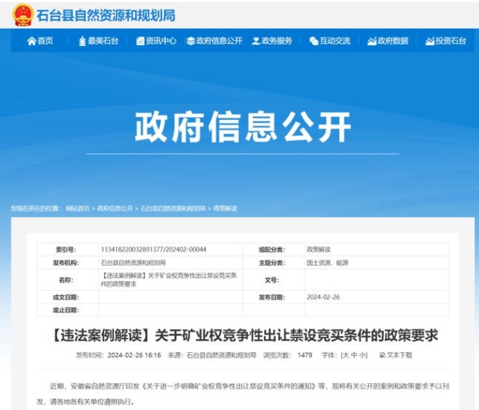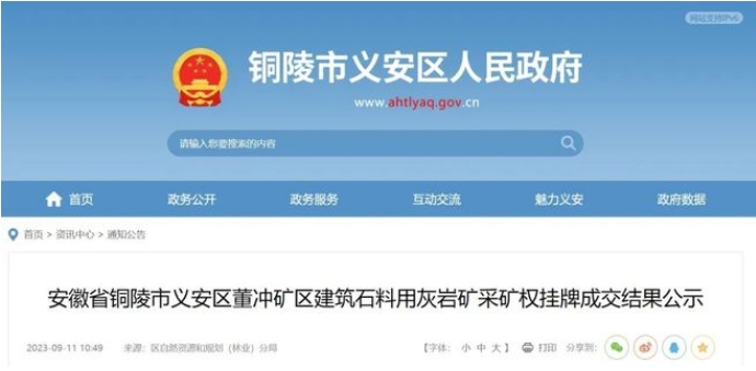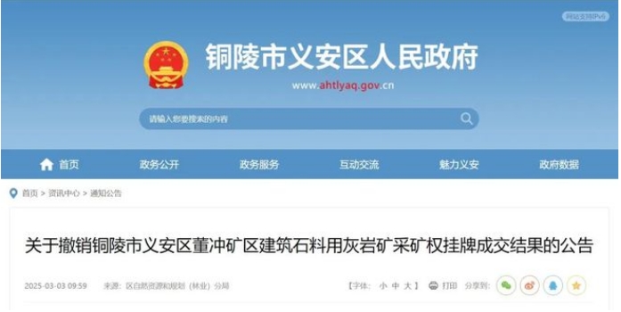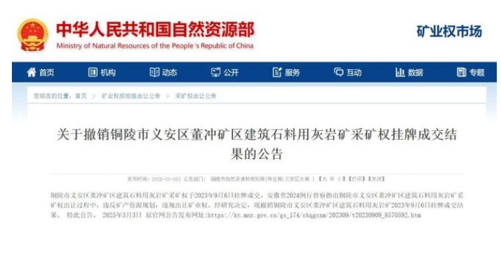 經(jīng)研究決定,現(xiàn)撤銷銅陵市義安區(qū)董沖礦區(qū)建筑石料用灰?guī)r礦2023年9月6日掛牌成交結(jié)果。 特此公告。 銅陵市自然資源和規(guī)劃局(林業(yè)局)義安區(qū)分局 2025年3月3日 公開信息顯示,2023年7月24日,銅陵市自然資源和規(guī)劃局(林業(yè)局)義安區(qū)分局發(fā)布公告,掛牌出讓義安區(qū)董沖礦區(qū)建筑石料用灰?guī)r礦采礦權(quán)。 公告信息顯示,采礦權(quán)位于銅陵市義安區(qū)天門鎮(zhèn)境內(nèi),礦區(qū)面積為0.2927km2,建筑石料用灰?guī)r礦(探明+控制+推斷)資源量 2078.4 萬立方米(5530.47 萬噸),其中探明資源量769.6 萬立方米(2045.53 萬噸),控制資源量 1060.9 萬立方米(2825.47 萬噸),推斷資源量 248.0 萬立方米(659.47 萬噸)。礦區(qū)范圍內(nèi)另有第四系覆蓋層及巖土為66.36萬立方米本次一并出讓。 2023年9月8日,銅陵市自然資源和規(guī)劃局(林業(yè)局)義安區(qū)分局發(fā)布公告,銅陵縣董沖礦業(yè)有限責任公司競得該采礦權(quán),掛牌出讓成交價為185305400元。 據(jù)中華人民共和國自然資源部2025年3月3日發(fā)布信息,銅陵市義安區(qū)董沖礦區(qū)建筑石料用灰?guī)r礦采礦權(quán)于2023年9月6日掛牌成交。安徽省2024例行督察指出銅陵市義安區(qū)董沖礦區(qū)建筑石料用灰?guī)r礦采礦權(quán)出讓過程中,違反礦產(chǎn)資源規(guī)劃,違規(guī)出讓礦業(yè)權(quán)。經(jīng)研究決定,現(xiàn)撤銷銅陵市義安區(qū)董沖礦區(qū)建筑石料用灰?guī)r礦2023年9月6日掛牌成交結(jié)果。特此公告。 此外,據(jù)石臺縣自然資源和規(guī)劃局2024年2月26日發(fā)布【違法案例解讀】信息顯示,近期安徽省自然資源廳印發(fā)《關(guān)于進一步明確礦業(yè)權(quán)競爭性出讓禁設(shè)競買條件的通知》等,現(xiàn)將有關(guān)公開的案例和政策要求予以刊發(fā),請各地各有關(guān)單位遵照執(zhí)行。 其中,省自然資源廳公布近期疑似違反礦業(yè)權(quán)出讓交易規(guī)則案例信息顯示,安徽省銅陵市義安區(qū)董沖礦區(qū)建筑石料用灰?guī)r礦在2023年7月24日發(fā)布的出讓公告中,疑似設(shè)置不合理和歧視性的準入、退出條件,排斥或者限制潛在競買人參與競買,違反《中共中央國務(wù)院關(guān)于加快建設(shè)全國統(tǒng)一大市場的意見》第(二十五)條“不得以備案、注冊、年檢、認定、認證、指定、要求設(shè)立分公司等形式設(shè)定或者變相設(shè)定準入障礙”、市場監(jiān)管總局等五部門《關(guān)于印發(fā)〈公平競爭審查制度實施細則〉的通知》(國市監(jiān)反壟規(guī)〔2021〕2號)第十三條“設(shè)置不合理或者歧視性的準入和退出條件的等有關(guān)政策規(guī)定”。省自然資源廳已要求暫停礦業(yè)權(quán)出讓后續(xù)的登記工作等。