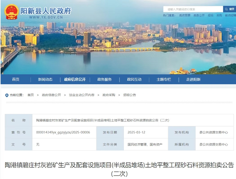 近日,湖北黃石陽(yáng)新縣公共資源交易中心發(fā)布陶港鎮(zhèn)碧莊村灰?guī)r礦生產(chǎn)及配套設(shè)施項(xiàng)目(半成品堆場(chǎng))土地平整工程砂石料資源拍賣公告(二次),根據(jù)拍賣公告該項(xiàng)目砂石料資源約7521081.19噸,起拍價(jià)人民幣94240000元,標(biāo)的競(jìng)買保證金1600萬(wàn)元。 此次出讓為該項(xiàng)目第二次出讓,2024年12月16日該項(xiàng)目首次出讓,因無(wú)人報(bào)名而流拍。相較于首次出讓,此次出讓項(xiàng)目競(jìng)買保障金由1700萬(wàn)降至1600萬(wàn)。該項(xiàng)目此次能否成功出讓,我們會(huì)持續(xù)關(guān)注! 拍賣標(biāo)的: 陶港鎮(zhèn)碧莊村灰?guī)r礦生產(chǎn)及配套設(shè)施項(xiàng)目(半成品堆場(chǎng))土地平整工程砂石料資源,約7521081.19噸,起拍價(jià)人民幣94240000元,標(biāo)的競(jìng)買保證金1600萬(wàn)元。 競(jìng)買資格及要求: 1、參加本次拍賣的競(jìng)買人須為企業(yè)法人,報(bào)名企業(yè)須為陽(yáng)新縣市場(chǎng)監(jiān)督管理局注冊(cè),并且具有深加工資質(zhì)的實(shí)地企業(yè)。 2、報(bào)名企業(yè)需提供本單位的環(huán)保評(píng)估報(bào)告(復(fù)印件)。 3、本次拍賣不接受聯(lián)合體競(jìng)買。 4、在“信用中國(guó)”網(wǎng)(www.creditchina.gov.cn)中未被列入失信被執(zhí)行人、重大稅收違法失信主體、政府采購(gòu)嚴(yán)重違法失信行為記錄名單,查詢時(shí)間以發(fā)布拍賣公告之后查詢結(jié)果為準(zhǔn),并將查詢結(jié)果附在競(jìng)拍申請(qǐng)文件中。 5、此次拍賣的標(biāo)的涉及用地、周邊工農(nóng)關(guān)系、環(huán)保、運(yùn)輸?shù)认嚓P(guān)矛盾由買受人自行解決,且該標(biāo)的挖掘、上車、卸車、運(yùn)輸?shù)扔少I受人自行負(fù)責(zé),費(fèi)用自行承擔(dān)。 6、競(jìng)買申請(qǐng)人應(yīng)于2025年3月13日至2025年3月20日17時(shí)前到武漢星辰拍賣有限公司提交書(shū)面申請(qǐng),保證金交納截止時(shí)間為2025年3月20日16時(shí)整,(以到賬時(shí)間為準(zhǔn))。 標(biāo)的展示時(shí)間及地點(diǎn): 本標(biāo)的即日起接受咨詢,各意向競(jìng)買人可自行前往現(xiàn)場(chǎng)勘測(cè)。 競(jìng)買手續(xù)辦理: 本次拍賣標(biāo)的詳細(xì)信息見(jiàn)“拍賣文件”。有意競(jìng)買者請(qǐng)攜帶相關(guān)報(bào)名資料及交款憑證于2025年3月20日17時(shí)前到我公司辦理競(jìng)買登記手續(xù),逾期不予受理。 報(bào)名聯(lián)系人及電話: 陳偉 15586555550
