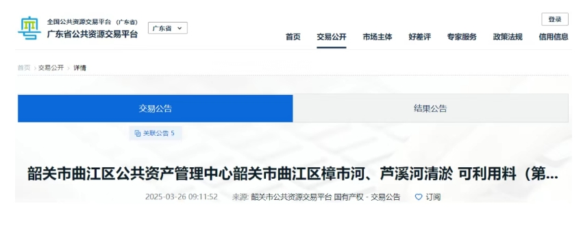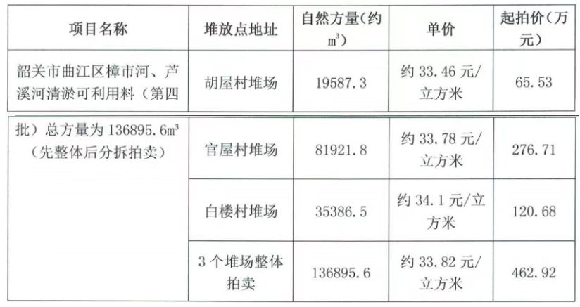 近日,韶關(guān)市曲江區(qū)樟市河、蘆溪河清淤可利用料(第四批)總方量為136895.6m³(先整體后分拆拍賣)公開拍賣,起拍價(jià)462.92萬。 整體拍賣時(shí)間:2025年4月8日上午9:30至10:30 分拆拍賣時(shí)間:2025年4月8日下午15:00至16:00 當(dāng)整體拍賣成交后,則分拆拍賣自動終止。 標(biāo)的編號:1 標(biāo)的名稱:韶關(guān)市曲江區(qū)樟市河、蘆溪河清淤可利用料(第四批)總方量為136895.6m³(整體拍賣) 保證金:70萬元 起拍價(jià):462.92萬元 增價(jià)幅度:1000元/次 標(biāo)的編號:2 標(biāo)的名稱:韶關(guān)市曲江區(qū)樟市河、蘆溪河清淤工程項(xiàng)目樟市河段胡屋村19587.3m³清淤可利用料 保證金:15萬元 起拍價(jià):65.53萬元 增價(jià)幅度:1000元/次 標(biāo)的編號:3 標(biāo)的名稱:韶關(guān)市曲江區(qū)樟市河、蘆溪河清淤工程項(xiàng)目樟市河段官屋村81921.8m³清淤可利用料 保證金:30萬元 起拍價(jià):276.71萬元 增價(jià)幅度:1000元/次 標(biāo)的編號:4 標(biāo)的名稱:韶關(guān)市曲江區(qū)樟市河、蘆溪河清淤工程項(xiàng)目樟市河段白樓村35386.5m³清淤可利用料 保證金:25萬元 起拍價(jià):120.68萬元 增價(jià)幅度:1000元/次 看樣時(shí)間:2025年3月26-31日;看樣地點(diǎn):標(biāo)的所在地。 網(wǎng)上報(bào)名時(shí)間:有意競買人自2025年3月26日上午9時(shí)30分起至2025年4月7日下午5時(shí)前均可通過韶關(guān)市公共資源交易一體化平臺完成報(bào)名手續(xù)并通過資格審核。 拍賣開始自由競價(jià)時(shí)間:整體拍賣時(shí)間:2025年4月8日上午9:30至10:30,分拆拍賣時(shí)間:2025年4月8日下午15:00-16:00,當(dāng)整體拍賣成交后,則分拆拍賣自動終止。限時(shí)競價(jià)時(shí)間:5分鐘。 聯(lián)系電話:0751-6663943 技術(shù)支持電話:0751-8379657、8379671