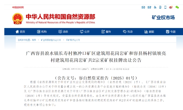 近日,廣西容縣浪水鎮(zhèn)長壽村獨沖口礦區(qū)建筑用花崗巖礦和容縣楊村鎮(zhèn)坡亮村建筑用花崗巖礦共2宗采礦權(quán)掛牌出讓。 廣西容縣浪水鎮(zhèn)長壽村獨沖口礦區(qū)建筑用花崗巖礦位于容縣浪水鎮(zhèn)長壽村一帶,開采礦種建筑用花崗巖,保有查明建筑用砂1097.59萬噸、機制砂6831.63萬噸、建筑用花崗巖礦3591.12萬噸,資源儲量合計11520萬噸,掛牌起始價18600萬元; 容縣楊村鎮(zhèn)坡亮村建筑用花崗巖礦容縣楊村鎮(zhèn)坡亮村一帶,開采礦種:建筑用花崗巖,保有查明建筑用砂296.66萬噸、機制砂797.73萬噸、建筑用花崗巖礦9429.09萬噸,資源儲量合計10523萬噸,掛牌起始價9600萬元。 兩宗礦權(quán)總儲量超2.2億噸,起始價共計2.82億元,噸成本約1.28元/噸。 01、廣西容縣浪水鎮(zhèn)長壽村獨沖口礦區(qū)建筑用花崗巖礦 開采礦種:建筑用花崗巖 地理位置:容縣浪水鎮(zhèn)長壽村一帶 資源儲量:保有查明建筑用砂(全風(fēng)化層)資源量為657.24萬立方米(1097.59萬噸),機制砂(中風(fēng)化層及破碎新鮮花崗巖層)資源量為2627.55萬立方米(6831.63萬噸),建筑用花崗巖礦(新鮮基巖)資源量為1344.99萬立方米(3591.12萬噸)。可利用建筑用砂(全風(fēng)化層)資源量為640.73萬立方米(合1070.02萬噸),可利用機制砂(中風(fēng)化層及破碎新鮮花崗巖層)資源量為1875.69萬立方米(4876.79萬噸),可利用建筑用花崗巖礦(新鮮基巖)資源量為997.95萬立方米(2664.53萬噸)。 開采標(biāo)高: 299.38米至 100米 資源開發(fā)利用情況:采礦權(quán)新立,無開采活動。 礦山地質(zhì)環(huán)境保護及土地復(fù)墾要求:為了保護生態(tài)環(huán)境,創(chuàng)建綠色礦山,競得人需承擔(dān)礦區(qū)礦山地質(zhì)環(huán)境恢復(fù)治理和土地復(fù)墾主體責(zé)任。礦山開采,生產(chǎn)加工區(qū)必須按照環(huán)保要求進行布置,且各加工區(qū)工序及廢棄物排放需達到國家的相關(guān)標(biāo)準(zhǔn)。 擬出讓年限:20年(含基建期約1.2年) 起始價:18600萬元 出讓方式:掛牌 掛牌時間:2025年04月29日—2025年05月16日 2025年4月29日9時至2025年5月16日10時。 網(wǎng)上地址: http://ggzy.jgswj.gxzf.gov.cn/gxggzy/tydl/login.html 02、容縣楊村鎮(zhèn)坡亮村建筑用花崗巖礦 開采礦種:建筑用花崗巖 地理位置:容縣楊村鎮(zhèn)坡亮村一帶 資源儲量:保有查明建筑用砂(全風(fēng)化層)資源量為186.58萬立方米(合296.66萬噸),機制砂(中風(fēng)化層及破碎新鮮花崗巖層)資源量為320.37萬立方米(合797.73萬噸),建筑用花崗巖礦(新鮮基巖)資源量為3786.78萬立方米(合9429.09萬噸)。可利用建筑用砂(全風(fēng)化層)資源量為171.53萬立方米(合272.73萬噸),可利用機制砂(中風(fēng)化層及破碎新鮮花崗巖層)資源量為272.92萬立方米(合679.57萬噸),可利用建筑用花崗巖礦(新鮮基巖)資源量為1384.73萬立方米(合3447.98萬噸)。 開采標(biāo)高: 583米至 280米 資源開發(fā)利用情況:采礦權(quán)新立,無開采活動。 礦山地質(zhì)環(huán)境保護及土地復(fù)墾要求:為了保護生態(tài)環(huán)境,創(chuàng)建綠色礦山,競得人需承擔(dān)礦區(qū)礦山地質(zhì)環(huán)境恢復(fù)治理和土地復(fù)墾主體責(zé)任。礦山開采,生產(chǎn)加工區(qū)必須按照環(huán)保要求進行布置,且各加工區(qū)工序及廢棄物排放需達到國家的相關(guān)標(biāo)準(zhǔn)。 擬出讓年限:20年(含基建期約2年) 起始價:9600萬元 出讓方式:掛牌 掛牌時間:2025年04月29日—2025年05月16日 2025年4月29日9時至2025年5月16日10時 網(wǎng)上地址:http://ggzy.jgswj.gxzf.gov.cn/gxggzy/tydl/login.html 據(jù)公告顯示,擬出讓兩個采礦權(quán)僅可對建筑用花崗巖礦、建筑用砂礦、中風(fēng)化花崗巖礦等進行開發(fā)利用,競得人應(yīng)嚴格按照批準(zhǔn)的礦種及編制的開發(fā)利用方案開采。競得人在開采過程中如發(fā)現(xiàn)有未批準(zhǔn)或出讓的其它礦種,應(yīng)停止開采作業(yè),及時采取保護和安全管護等措施,并報告容縣自然資源局,待有權(quán)限的自然資源部門處理完畢后方可繼續(xù)生產(chǎn)。若故意隱瞞不報、擅自銷售或造成國家礦產(chǎn)資源破壞、流失的,競得人應(yīng)承擔(dān)相應(yīng)的法律責(zé)任。