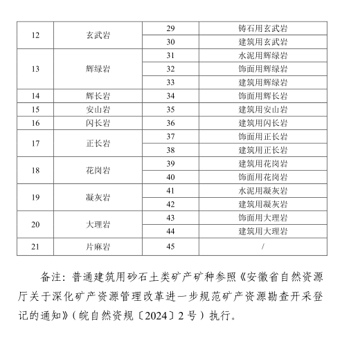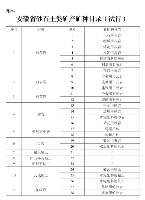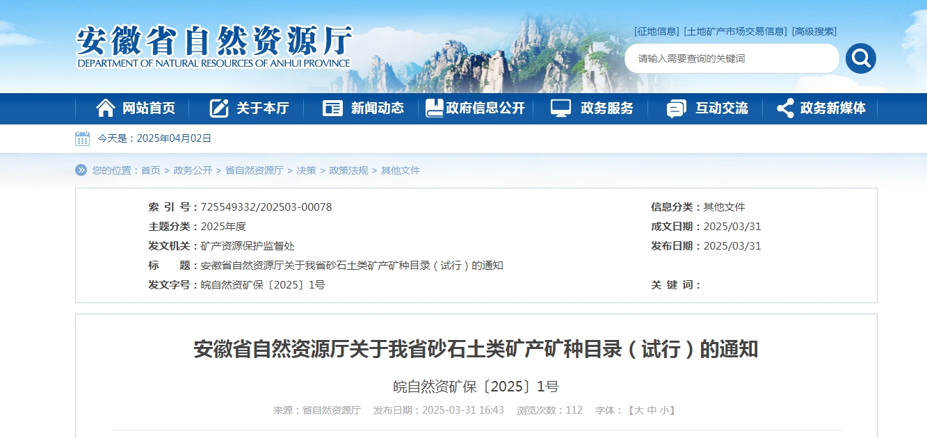 安徽省自然資源廳關(guān)于我省砂石土類礦產(chǎn)礦種目錄(試行)的通知 皖自然資礦保〔2025〕1號(hào) 各市、縣(市、區(qū))自然資源和規(guī)劃局: 為貫徹落實(shí)《自然資源部關(guān)于進(jìn)一步完善礦產(chǎn)資源勘查開(kāi)采登記管理的通知》(自然資規(guī)〔2023〕4號(hào))《自然資源部關(guān)于深化礦產(chǎn)資源管理改革若干事項(xiàng)的意見(jiàn)》(自然資規(guī)〔2023〕6號(hào))等有關(guān)文件要求,進(jìn)一步規(guī)范砂石土類礦產(chǎn)資源管理,省自然資源廳制定了《安徽省砂石土類礦產(chǎn)礦種目錄(試行)》,現(xiàn)印發(fā)給你們,請(qǐng)結(jié)合實(shí)際貫徹執(zhí)行。