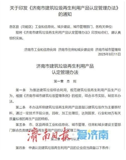 為推進(jìn)建筑垃圾綜合利用,規(guī)范建筑垃圾再生利用產(chǎn)品生產(chǎn)行為,近日濟(jì)南市工業(yè)和信息化局、濟(jì)南市住房和城鄉(xiāng)建設(shè)局和濟(jì)南市城市管理局聯(lián)合發(fā)布通知,印發(fā)《濟(jì)南市建筑垃圾再生利用產(chǎn)品認(rèn)定管理辦法》(以下簡稱《管理辦法》)。 根據(jù)《管理辦法》,市級及以下財政性資金占主導(dǎo)的建設(shè)工程項目,應(yīng)當(dāng)優(yōu)先使用建筑垃圾再生利用產(chǎn)品,其中,市政工程、園林工程、道路工程、水務(wù)工程等項目,在可使用建筑垃圾再生利用產(chǎn)品部位,應(yīng)使用再生利用產(chǎn)品且使用比例不低于15%。 申請認(rèn)定企業(yè)產(chǎn)品中建筑垃圾含量不低于50% 根據(jù)《管理辦法》,建筑垃圾再生利用產(chǎn)品是指以建筑垃圾作為主要原材料,通過一定技術(shù)手段分類、回收、加工處理后,達(dá)到國家、行業(yè)和地方有關(guān)質(zhì)量標(biāo)準(zhǔn)的再生產(chǎn)品的統(tǒng)稱。市、區(qū)縣兩級工業(yè)和信息化、城市管理、住房和城鄉(xiāng)建設(shè)主管部門聯(lián)合負(fù)責(zé)建筑垃圾再生利用產(chǎn)品的認(rèn)定管理工作。 《管理辦法》明確,申請認(rèn)定建筑垃圾再生利用產(chǎn)品的企業(yè)應(yīng)當(dāng)具備以下條件:具有獨立法人資格,取得城市管理主管部門出具的建筑廢棄物消納審批核準(zhǔn)且處于正常生產(chǎn)運行階段,具有建筑垃圾再生利用產(chǎn)品質(zhì)量管理規(guī)章制度等;生產(chǎn)的建筑垃圾再生利用產(chǎn)品應(yīng)當(dāng)符合相關(guān)國家標(biāo)準(zhǔn)、行業(yè)標(biāo)準(zhǔn)和地方標(biāo)準(zhǔn),且產(chǎn)品中建筑垃圾的含量不低于50%。 經(jīng)審查符合要求產(chǎn)品公示后將出具認(rèn)定證書 企業(yè)應(yīng)當(dāng)如何申請認(rèn)定建筑垃圾再生利用產(chǎn)品?《管理辦法》提出,符合條件的企業(yè)須自愿向所在地的區(qū)縣(功能區(qū))工業(yè)和信息化主管部門申報,并如實填報《濟(jì)南市建筑垃圾再生利用產(chǎn)品認(rèn)定申請表》及相關(guān)證明材料。各區(qū)縣(功能區(qū))工業(yè)和信息化主管部門會同城市管理、住房和城鄉(xiāng)建設(shè)主管部門對申請認(rèn)定的建筑垃圾再生利用產(chǎn)品的相關(guān)情況進(jìn)行核實,并簽署推薦意見后報市工業(yè)和信息化局。市工業(yè)和信息化局會同市城市管理局、市住房和城鄉(xiāng)建設(shè)局組織有關(guān)專家或委托有關(guān)機(jī)構(gòu),對區(qū)縣(功能區(qū))審核上報的建筑垃圾再生利用產(chǎn)品進(jìn)行審查。 對經(jīng)審查符合要求的建筑垃圾再生利用產(chǎn)品進(jìn)行網(wǎng)上公示。對公示期間有異議的,將進(jìn)一步核實;對無異議的,以市工業(yè)和信息化局、市城市管理局、市住房和城鄉(xiāng)建設(shè)局的名義予以認(rèn)定,并出具“濟(jì)南市建筑垃圾再生利用產(chǎn)品認(rèn)定證書”,認(rèn)定證書應(yīng)當(dāng)包括以下內(nèi)容:再生利用產(chǎn)品名稱;再生利用企業(yè)名稱、地址、消納備案證明編號;再生利用產(chǎn)品類別及生產(chǎn)原料中的建筑廢棄物含量;再生利用產(chǎn)品適用工程部位和適用標(biāo)準(zhǔn);發(fā)證機(jī)構(gòu)、發(fā)證日期和有效期;證書編號。認(rèn)定證書的有效期為三年。認(rèn)定證書有效期內(nèi)證書內(nèi)容發(fā)生變更的,再生利用企業(yè)應(yīng)當(dāng)在變更后30日內(nèi)向所在地的區(qū)縣(功能區(qū))工業(yè)和信息化、城市管理、住房和城鄉(xiāng)建設(shè)主管部門報送相關(guān)情況,并及時重新提出認(rèn)定申請。 鼓勵各類建設(shè)項目使用建筑垃圾再生利用產(chǎn)品 《管理辦法》也明確了相關(guān)支持政策。市級及以下財政性資金占主導(dǎo)的建設(shè)工程項目,應(yīng)當(dāng)優(yōu)先使用建筑垃圾再生利用產(chǎn)品,其中:市政工程、園林工程、道路工程、水務(wù)工程等項目,在可使用建筑垃圾再生利用產(chǎn)品部位,應(yīng)使用再生利用產(chǎn)品且使用比例不低于15%;房屋建筑工程項目,在可使用建筑垃圾再生利用產(chǎn)品部位,應(yīng)使用再生利用產(chǎn)品且使用比例不低于5%。 《管理辦法》要求,市級及以下財政性資金占主導(dǎo)的建設(shè)工程項目按規(guī)定使用建筑垃圾再生利用產(chǎn)品,各相關(guān)責(zé)任主體應(yīng)當(dāng)按照以下要求實施:建設(shè)單位在工程項目建議書或可行性研究階段應(yīng)當(dāng)對建筑垃圾的處置和使用再生利用產(chǎn)品作相應(yīng)論證;在工程招標(biāo)和材料采購環(huán)節(jié)應(yīng)當(dāng)對再生利用產(chǎn)品的使用明確具體要求并組織驗收;財政性資金占主導(dǎo)的建設(shè)項目業(yè)主單位在招投標(biāo)過程中,應(yīng)在招標(biāo)文件中明確招標(biāo)項目再生利用產(chǎn)品使用比例;設(shè)計單位應(yīng)當(dāng)根據(jù)建設(shè)單位設(shè)計任務(wù)書的要求在施工圖設(shè)計文件中載明再生利用產(chǎn)品的使用部位、最低應(yīng)用比例和技術(shù)指標(biāo);施工單位應(yīng)當(dāng)選用符合設(shè)計要求的再生利用產(chǎn)品,且用量應(yīng)符合相關(guān)要求。再生利用產(chǎn)品進(jìn)場驗收時,應(yīng)將再生企業(yè)提供的再生利用產(chǎn)品鑒