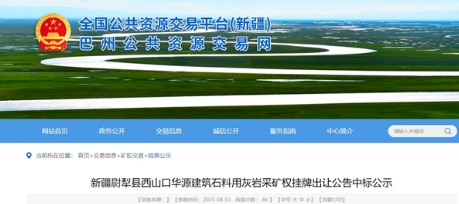 近日,新疆巴州公共資源交易網(wǎng)發(fā)布新疆尉犁縣西山口華源建筑石料用灰?guī)r采礦權(quán)掛牌出讓結(jié)果,尉犁縣尉恒建筑材料有限公司以804萬元競得該項目礦權(quán)。據(jù)悉,該項目起始價30萬元,溢價率高達2580%。 該項目礦區(qū)面積0.314平方千米,開采礦種建筑石料用灰?guī)r,資源儲量558.4萬方,出讓年限10年。 競得人尉犁縣尉恒建筑材料有限公司成立于2023年7月18日,所屬行業(yè)為非金屬礦物制品業(yè),經(jīng)營范圍包含預(yù)應(yīng)力混凝土鐵路橋梁簡支梁產(chǎn)品生產(chǎn)、道路貨物運輸(網(wǎng)絡(luò)貨運)/建筑物拆除作業(yè)(爆破作業(yè)除外)、建筑用鋼筋產(chǎn)品生產(chǎn)、砼結(jié)構(gòu)構(gòu)件制造、砼結(jié)構(gòu)構(gòu)件銷售、非金屬礦物制品制造、輕質(zhì)建筑材料銷售等。 據(jù)不完全統(tǒng)計,2025年第一季度,新疆共成功出讓57宗砂石礦,合計資源價款約5.2億元,資源儲量超3.44億噸,年產(chǎn)能約6250萬噸。此次,成功出讓的砂石礦,為今年溢價率最高的一宗采礦權(quán)。