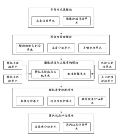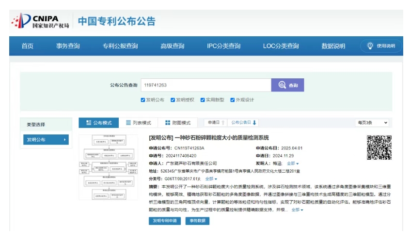 專利摘要顯示,本發(fā)明公開了一種砂石粉碎顆粒度大小的質(zhì)量檢測系統(tǒng),涉及碎石檢測技術(shù)領(lǐng)域,該系統(tǒng)通過多角度圖像采集模塊和三維重構(gòu)模塊,能夠高效、精確地獲取砂石顆粒的多角度圖像數(shù)據(jù),并通過圖像拼接與三維重構(gòu)技術(shù)生成高精度的三維顆粒模型。通過分析三維模型的三角網(wǎng)格頂點(diǎn)向量,計算顆粒的等效粒徑和均勻性指標(biāo)實(shí)現(xiàn)了對砂石顆粒質(zhì)量的自動化評估。能夠準(zhǔn)確地評估砂石顆粒的質(zhì)量與均勻性,為生產(chǎn)過程中的質(zhì)量控制提供精確數(shù)據(jù)支持,并根據(jù)砂石顆粒的尺寸與均勻性,及時生成破碎工藝調(diào)整預(yù)警,并為生產(chǎn)線提供精確的質(zhì)量檢測數(shù)據(jù)。這一技術(shù)顯著提高了檢測精度,替代了傳統(tǒng)人工篩分方式,降低了人為誤差,提高了生產(chǎn)效率和自動化程度。 根據(jù)天眼查資料顯示,廣東葫蘆砂石有限責(zé)任公司,成立于2021年,位于肇慶市,是一家以從事非金屬礦采選業(yè)為主的企業(yè)。企業(yè)注冊資本10000萬人民幣,實(shí)繳資本10000萬人民幣。通過天眼查大數(shù)據(jù)分析,廣東葫蘆砂石有限責(zé)任公司參與招投標(biāo)項目40次,專利信息2條,此外企業(yè)還擁有行政許可46個。